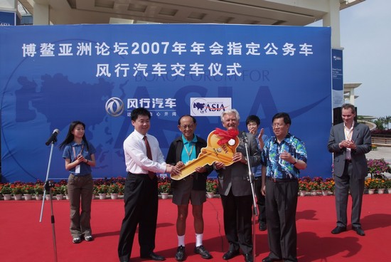 4月18日下午,在风景如画的海南博鳌,“博鳌亚洲论坛2007年年会指定公务车——风行汽车交车仪式”如期举行,已经81岁高龄的博鳌亚洲论坛理事长、菲律宾前总统拉莫斯先生,以及78岁高龄的博鳌亚洲论坛理事、澳大利亚前总理霍克先生应邀一起出席了这次交车仪式,这使本次活动成为了风行MPV与总统、总理级贵宾的首次会面。此外,博鳌亚洲论坛秘书长、中国入世首席谈判代表龙永图先生,以及东风柳州汽车有限公司副总经理杨振球先生、东风柳州汽车有限公司总经理特别助理覃政先生也一同出席了仪式。